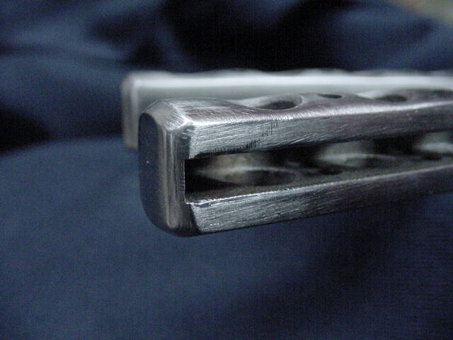 Balisong Gallery A Here's another Benchmade 42 that a brave owner has modified. He started by cutting off the latch. Like many who've tried this, he found one nasty void in the Titanium casting. Otherwise, his efforts came out quite nicely. Notice how nicely he's rounded off the ends of his handles.
